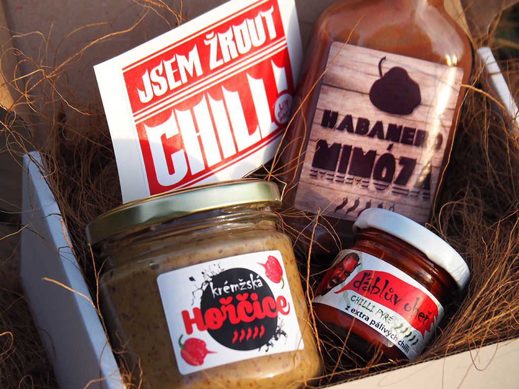 Ďáblův oheň: směs zralých plodů chilli (Trinidad Scorpion Moruga, Carolina Reaper, Jolokia Peach a další), vinný ocet, sůl, sorban draselný.